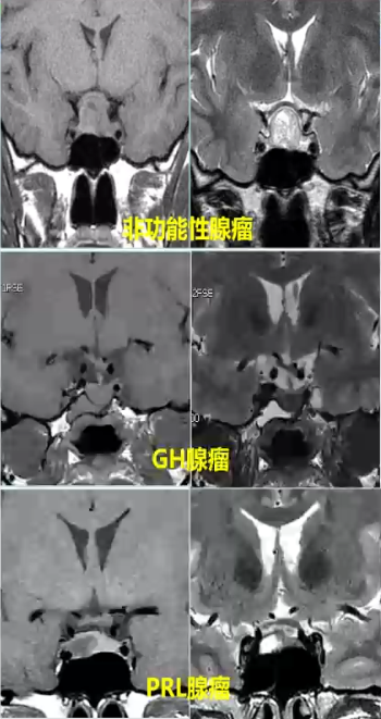 √非分泌大腺瘤T1WI多呈低、稍低及等信号(17.6%,14.7%,55.9%),T2WI为稍高、高信号(61.8%,32.4%)
