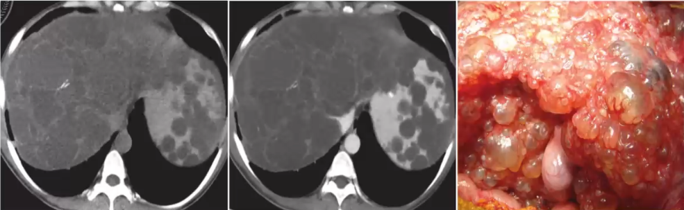 经常在腹部影像学检查中偶然发现,系胆管发育异常形成的小胆管丛,逐渐扩大、融合形成的肝囊性病变,不与胆管相通