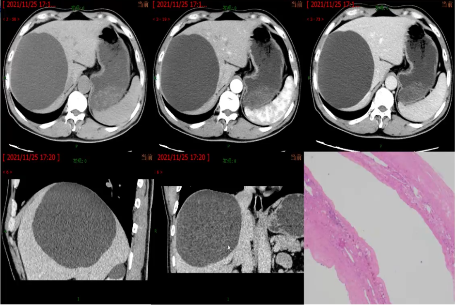 单纯性肝囊肿壁薄而光滑的病变,内衬立方上皮,分泌胆汁样液体,囊肿的直径<30 cm,并且可能包含多达2个隔膜