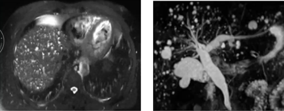 ❖ MR:显示肝内囊性病灶与胆管相通典型征象-悬挂征(囊状病变像“满天星”悬挂在胆道树)