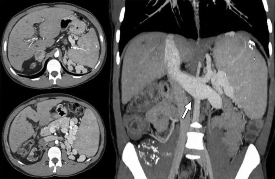 中心点征:囊状扩张的胆管内见小圆点状软组织密度影,增强后明显强化,可在偏侧,是扩张的胆管包绕点状门脉断面