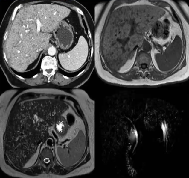 ❖ MRCP:所有病灶呈明显囊状高信号,沿胆管树分布,但不与胆管树相互交通