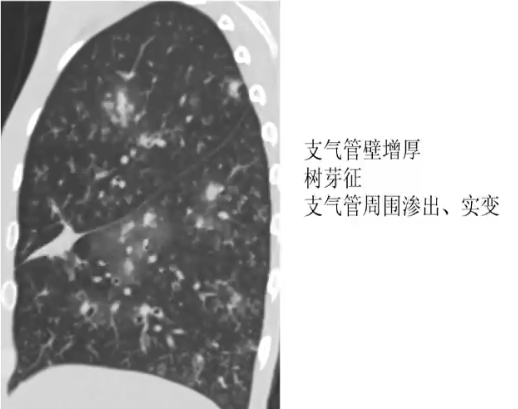 ❖ CT表现:气管、支气管壁增厚,支气管炎(小叶中心结节和树芽征)、支气管肺炎(肺门旁分布为主的实变)