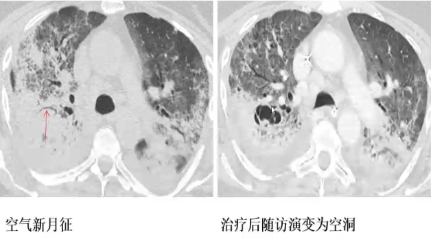 ❖ 治疗后2-3周左右,肺实变或结节影内出现新月形(空气新月征)或圆形空洞(梗死肺组织回缩)