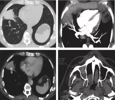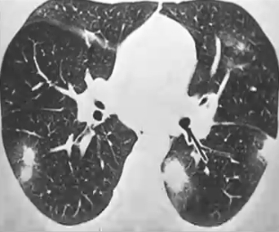 ❖ 急性和亚急性期:单/双肺结节,伴/不伴双肺弥漫斑片影,常伴有纵隔和肺门淋巴结增大