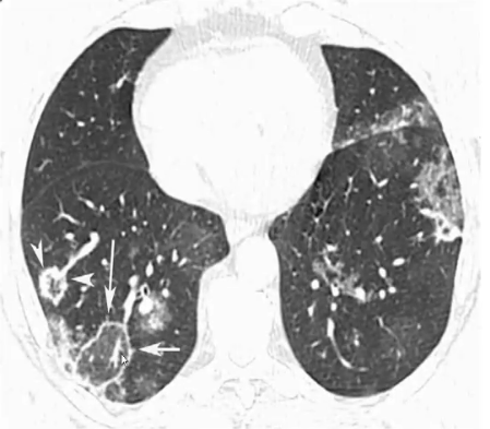❖ RHS:中下肺野、多发、毛刺状边缘,同时伴有其它类型肺实质异常,考虑此病
