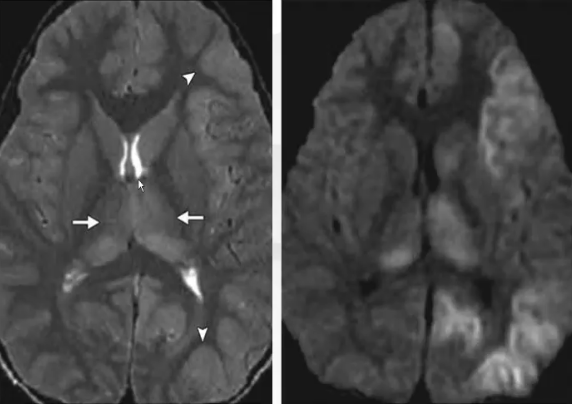 ❖ 毒性脑炎:多发或单发病灶,多见于双侧大脑半球额、顶、题叶及基底节-丘脑区,可对称或不规则分布,亦可累及脑干和小脑