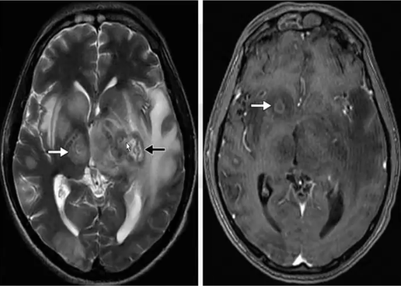❖ MRI在检测新老病灶方面均比CT更加敏感。在T2上活动性病灶的信号强度各不相同,可呈高信号,与周围水肿难以区分,也可呈等信号或低信号,可见同心圆靶征。T1上呈等信号或低信号。增强后呈环形或结节状强化,偏心性靶征,出血较为少见。
