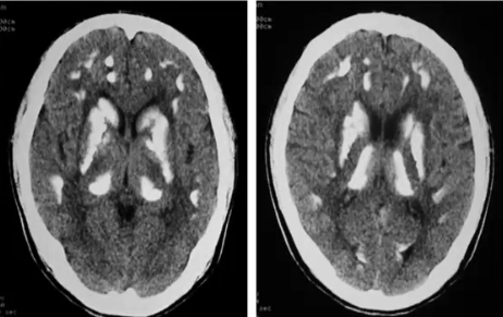 CT表现:主要表现为基底节或丘脑、脑叶、小脑齿状核区域多发对称性斑片状钙化。丘脑钙化表现为双侧类圆形,或尖向上的三角形。