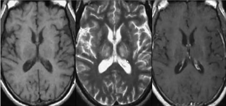 ❖ MR表现:病灶大部分为T2不均匀高信号,呈条纹状改变;少部分T2W为低信号,可能由多种离子尤其是铁离子过度沉积所致。T1信号常降低,但是由于铜的顺磁性,T1的信号亦有可能升高。对比增强无明显强化,在疾病早期可有弥散受限,随着组织坏死和海绵状组织降解,弥散相可能恢复正常。